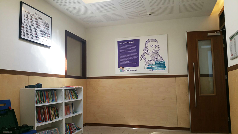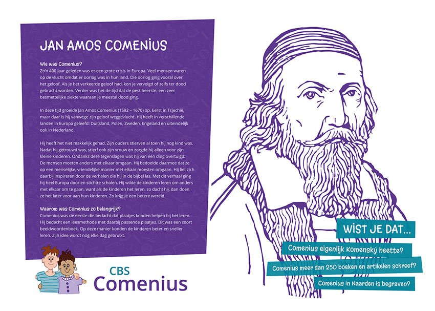 Comeniusschool Bord Voor de Comeniusschool hebben we diverse communicatie uitingen ontworpen en geproduceerd. Zo zijn ondermeer bezig geweest met de website, folders, borden een schoolkalender en een schoolgids. KenmerkenDesignDrukwerk Delen