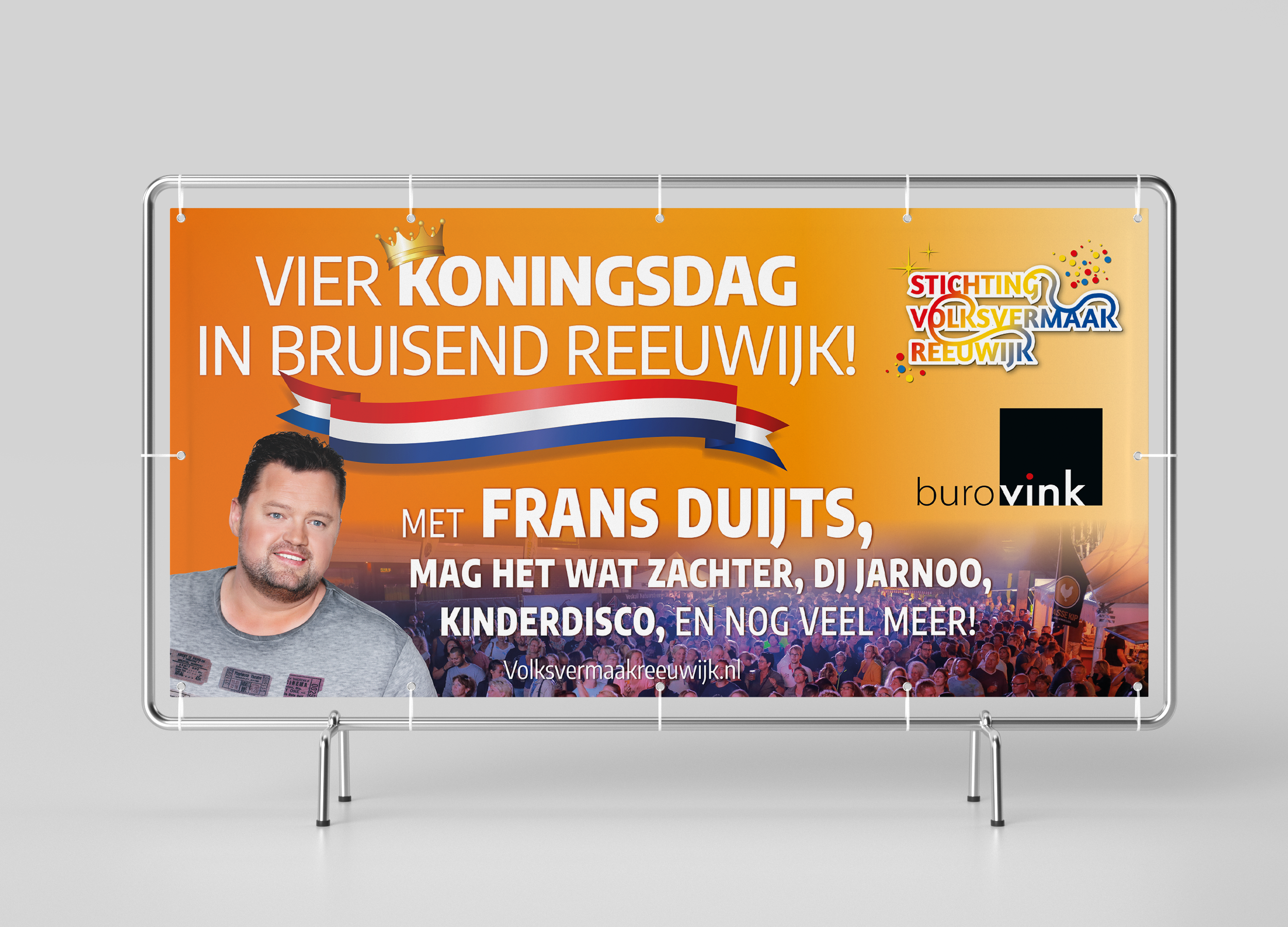Stichting Volksvermaak Reeuwijk is een non-profit organisatie die diverse evenementen organiseert in Reeuwijk. Buro vink sponsort de organisatie met een website, logo, huisstijl en het ontwerp van drukwerk zoals kleding, posters, hekwerkbanners etc. Ook verzorgen we een magazine en het programmablad voor Koningsdag en bruisend Reeuwijk.